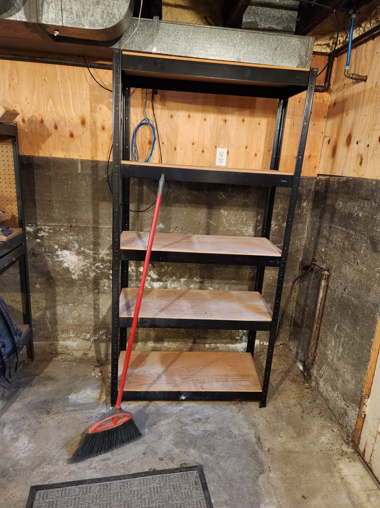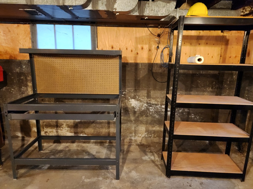 Basement work continues. Focus on the remaining corner of the basement that hasn’t been swept. There are two “furniture” pieces in this area, an older shelving unit and a workbench. The workbench is really just a place to pile tools and associated stuff, especially after the flood, because it was high and dry.