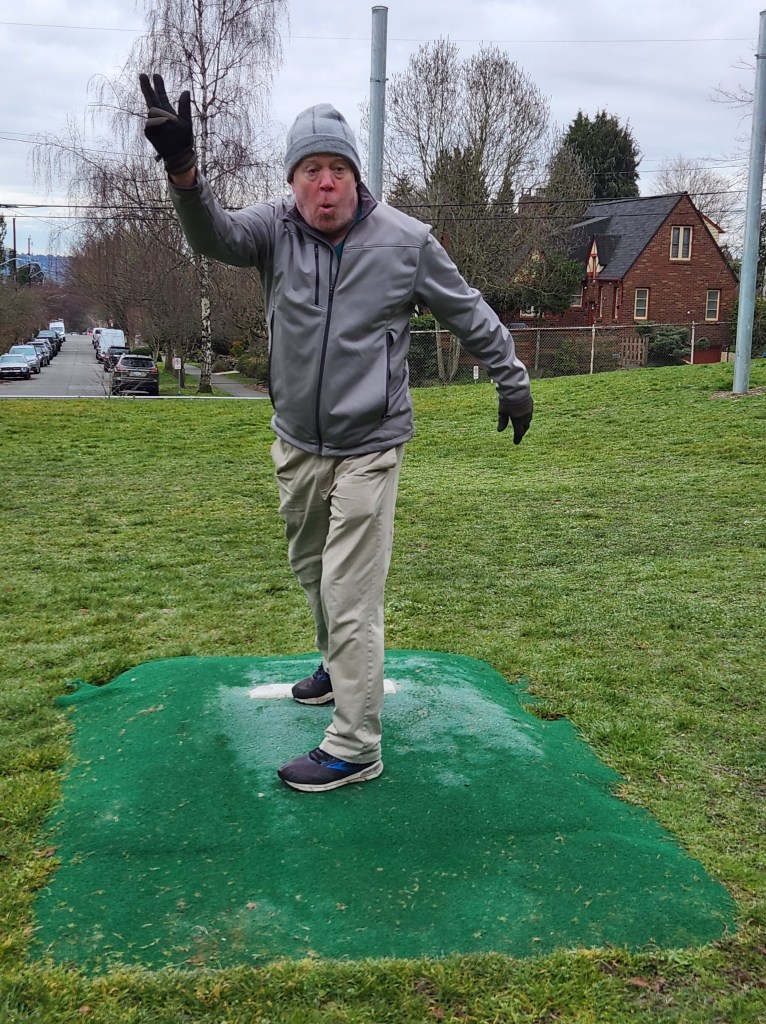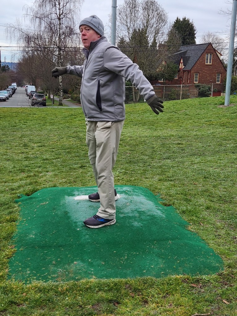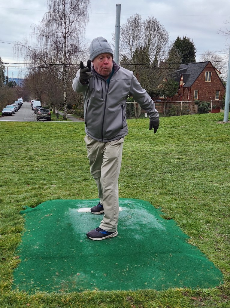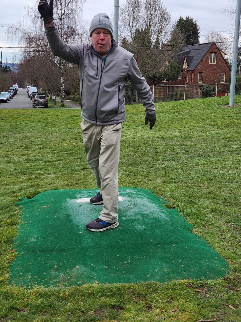 It was cold, but not raining. Our route took us through one of the little league fields. Carl can’t play for real right now, but wanted to relive past triumphs.