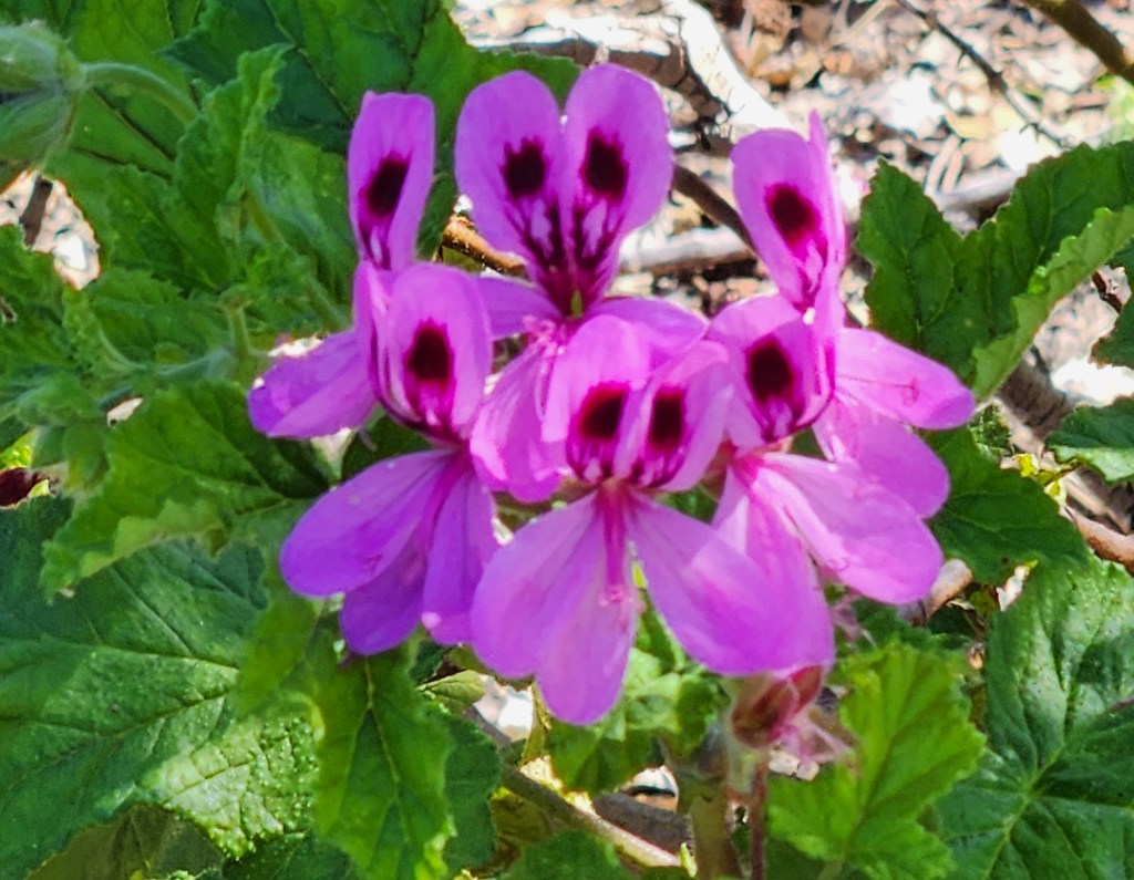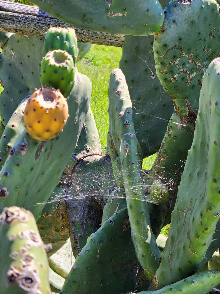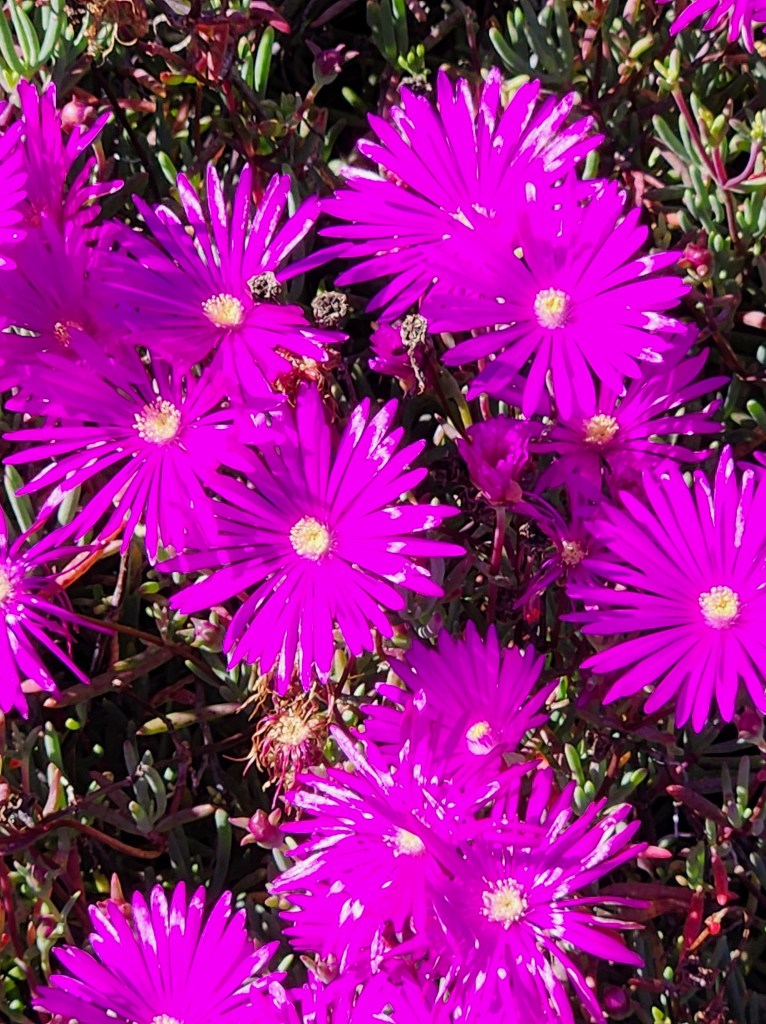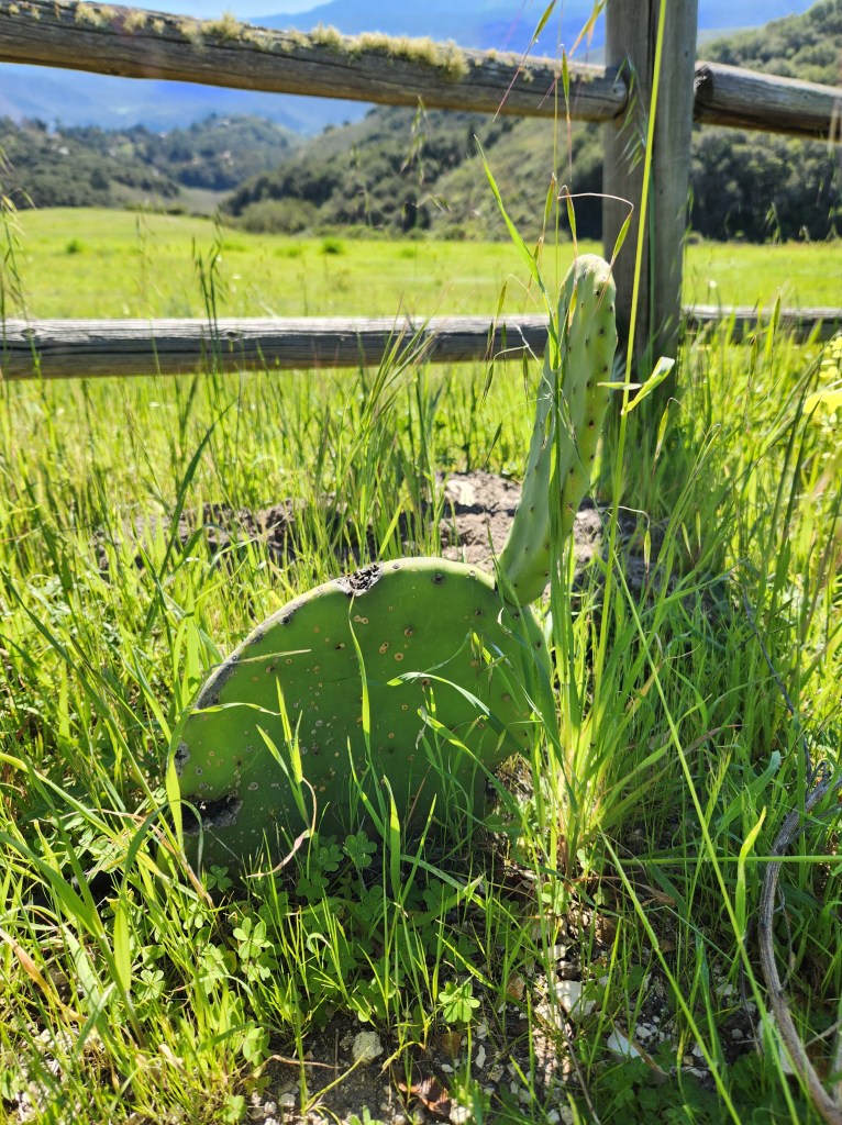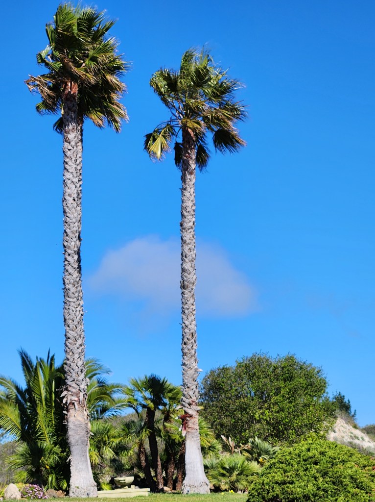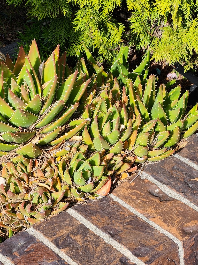 Prickly Pear CactusOakleaf Geranium possibly African DaisiesIce PlantBird of ParadiseGold Tooth AloePalm Trees (not the Big W)Western Fence Post Lizard