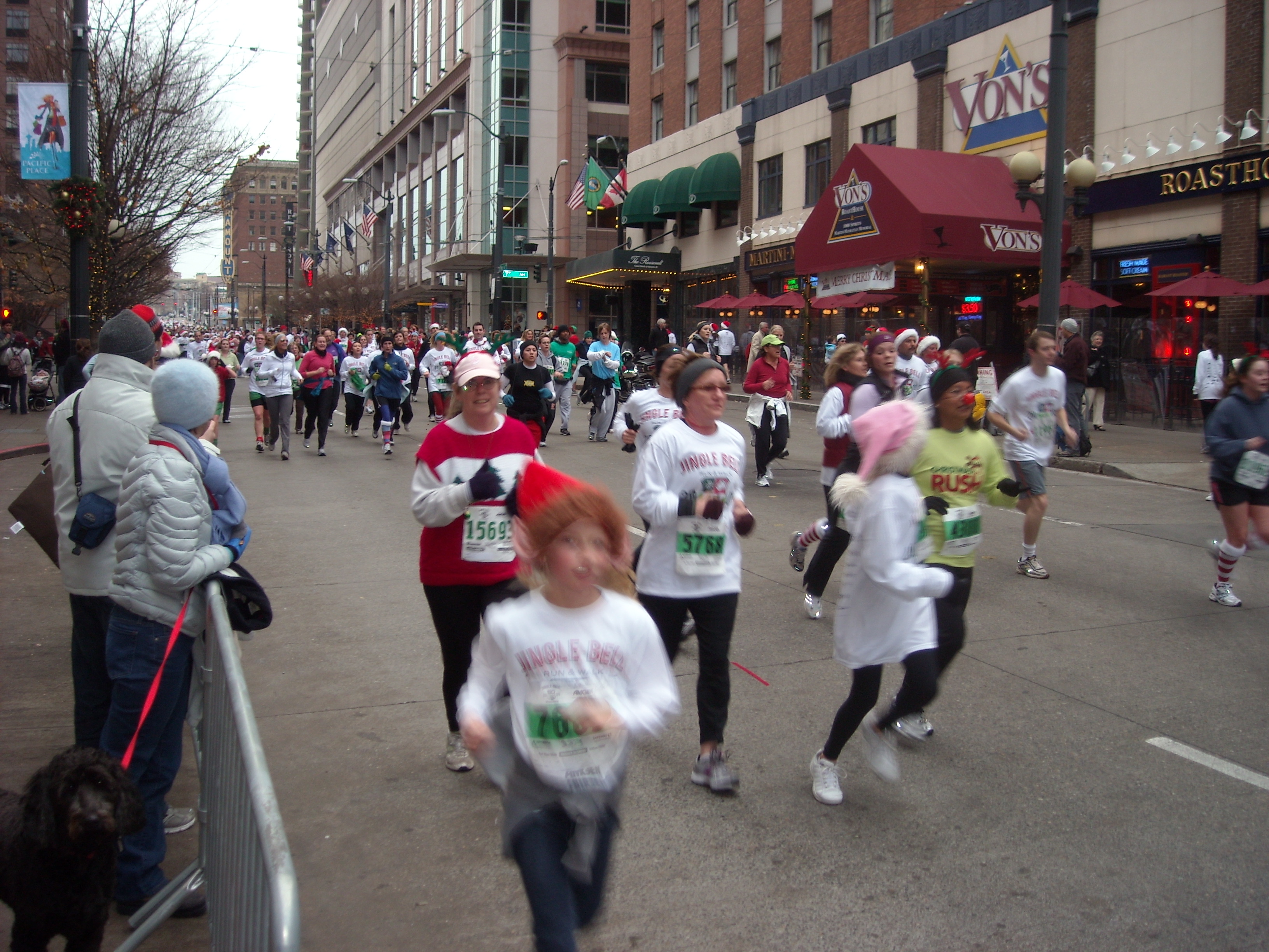 This morning was the BIG race. The Jingle Bell Run. Big as in lots of people. It was actually a very relaxed race as they go. Up early and trying to decide how many layers to put on. I ended up with 5, but 4 for the actual “running.” In the 30’s and no precipitation. For the record I started off running, and finished running. The parts in between, more running than not. Maybe I will actually train for one of these so I can look relaxed and ready to go even further.