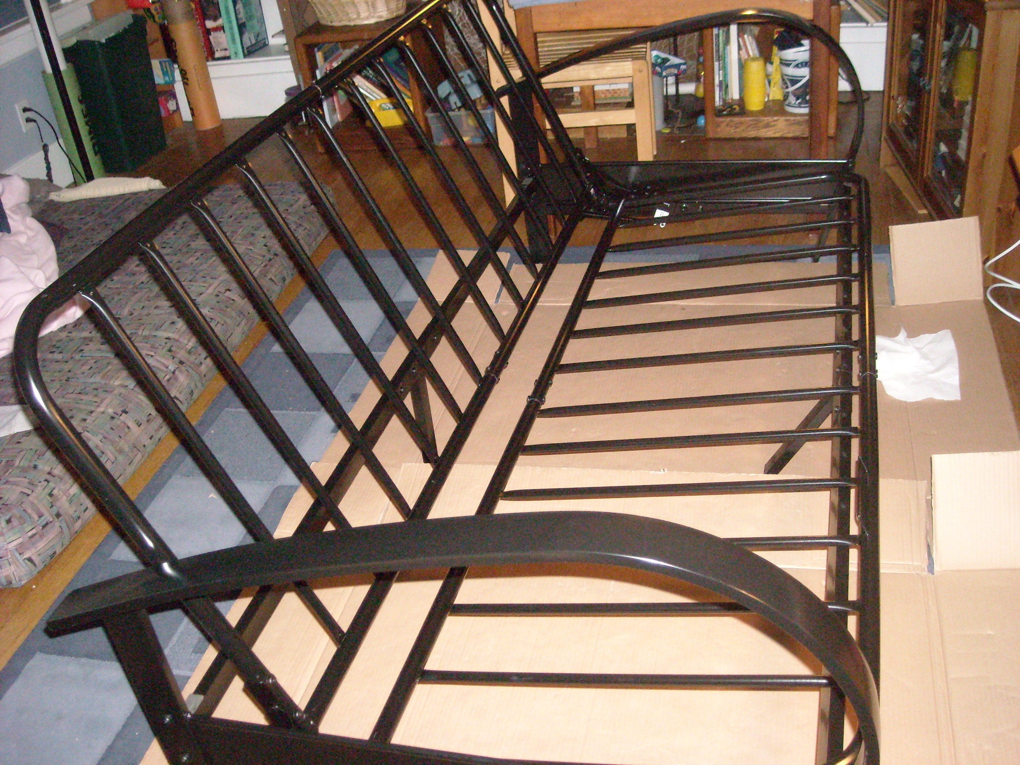 Now, finally putting together the futon. I think you get what you pay for, and I did not pay too much for this frame. Both of the end pieces say “inside left” on the sticker. Only one of them is correct. Guess which one I chose first. And partway through I found a design flaw. Which I decided to ignore as it was not a fatal flaw. Of course when it was time to put the long pieces (actually 2 short pieces bolted together – hence the smaller than expected box referenced a week or so ago) onto the frame, the incorrect “inside left” made itself known. It was about a 1/2-hour error. Here is the finished product.