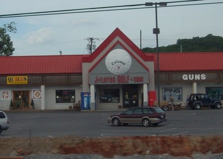 Sevierville, not the quiet side. Along the main drag with ALL of the tourists. We noticed the J Floyds Golf and Guns store, and had to get a picture. It was only in looking at the picture that I noticed the quilt store (left side)