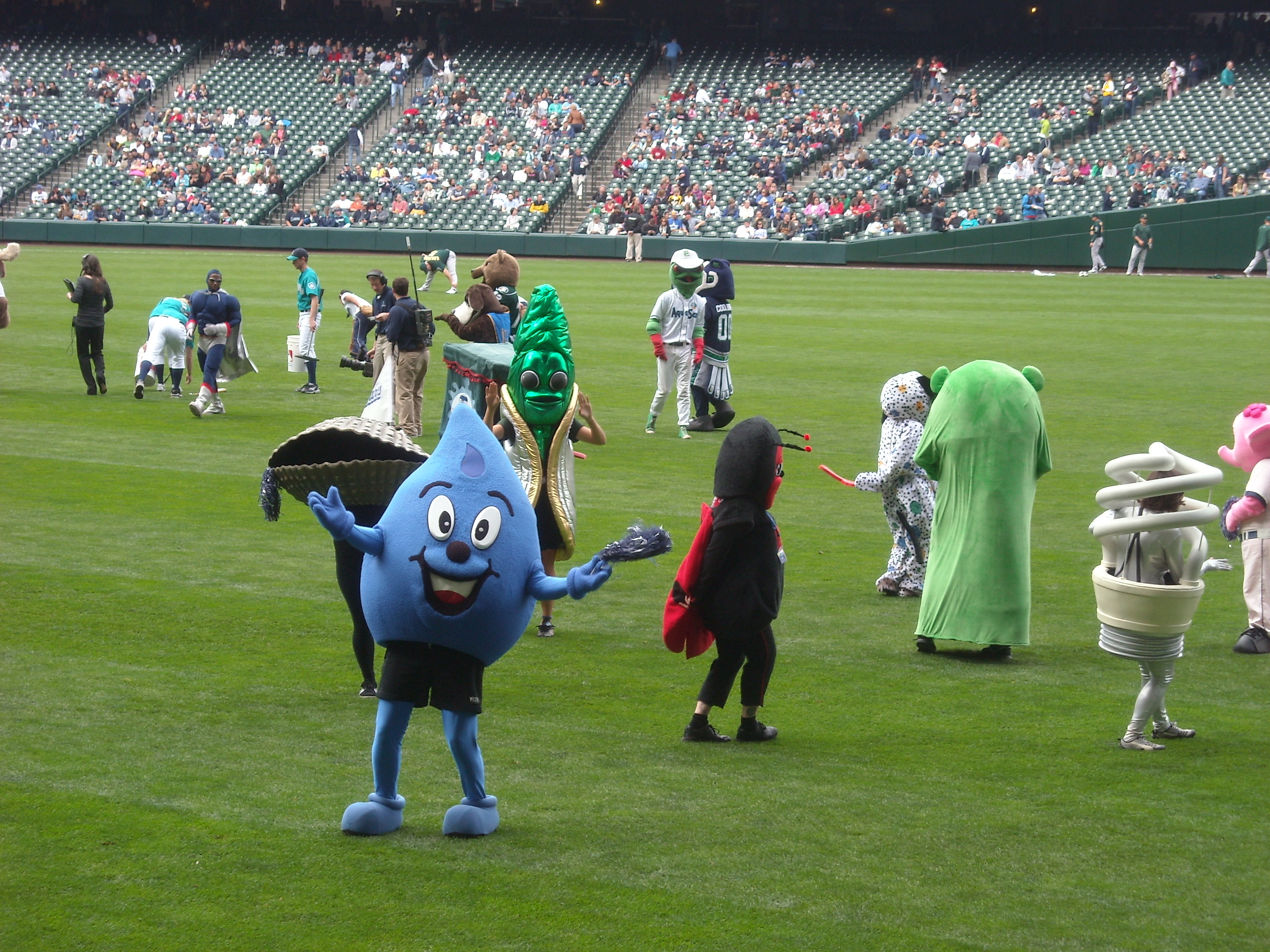 The mascot’s greeted fans, paraded and generally goofed around on the field before the game, greeted fans on the concourses, participated in the YMCA song in the stands, greeted fans on the concourses, sang and danced on the dugouts for the 7th inning stretch, and finally got to sit down (and cool down).