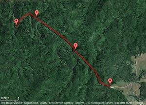 We parked and with our sandwiches in hand started along the 2.4 mile trail to the falls. The trail “follows” Abrams Creek, but with some ups that the creek just doesn’t take. They tend to flow downhill only. If you can see the creek in this aerial shot (dark line amidst the trees), the ups are where the red line (very approximate trail location) does not follow the creek.