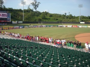 As it turns out, they were using the ballpark for the opening ceremonies for a softball tournament.
