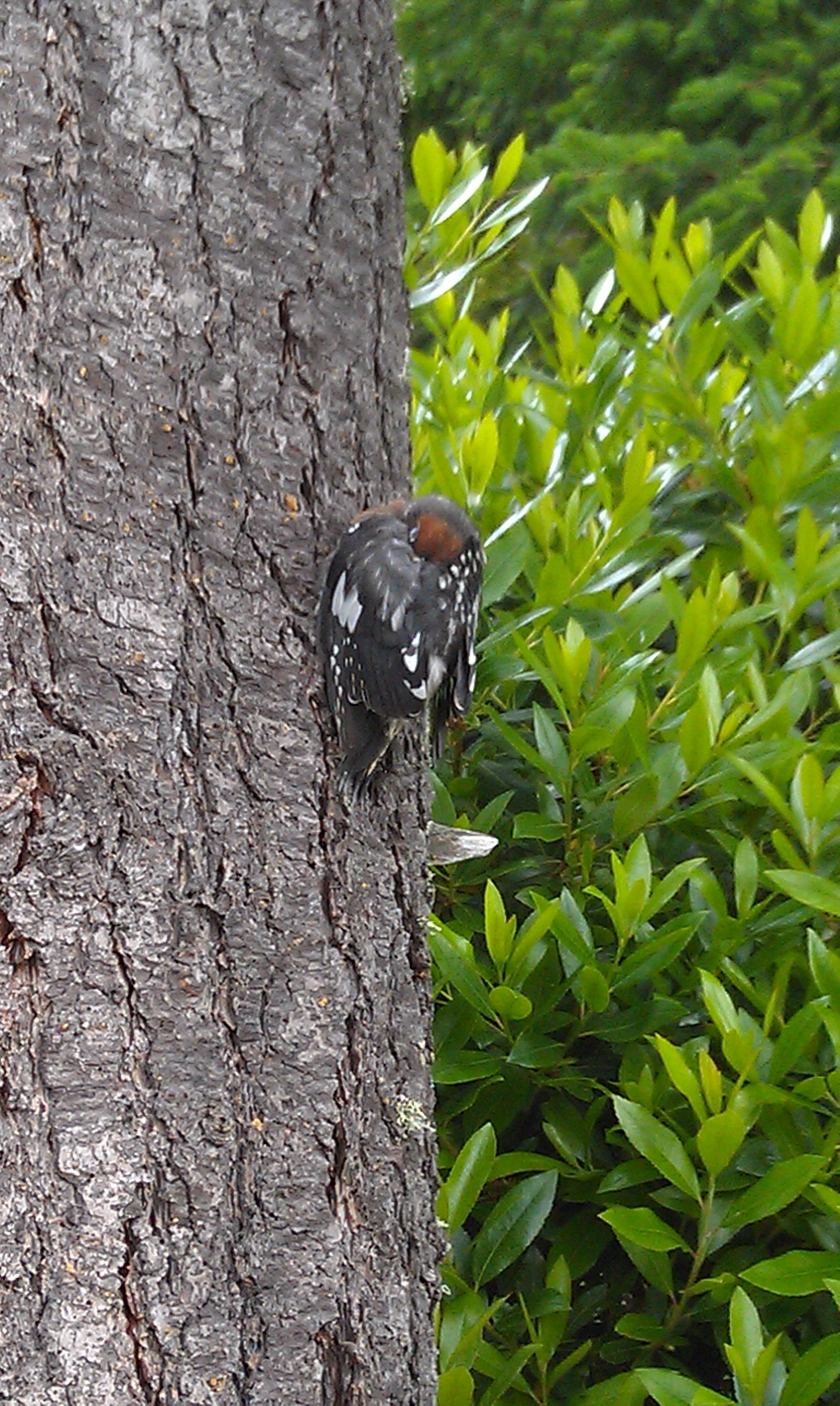 Yesterday at noon I walked, and came across this baby bird, both leaving and entering the work site. My knowledgeable work-mate decided it was a redheaded sapsucker. When I collected by phone from my office, and went back out, the bird had decided to take a nap.