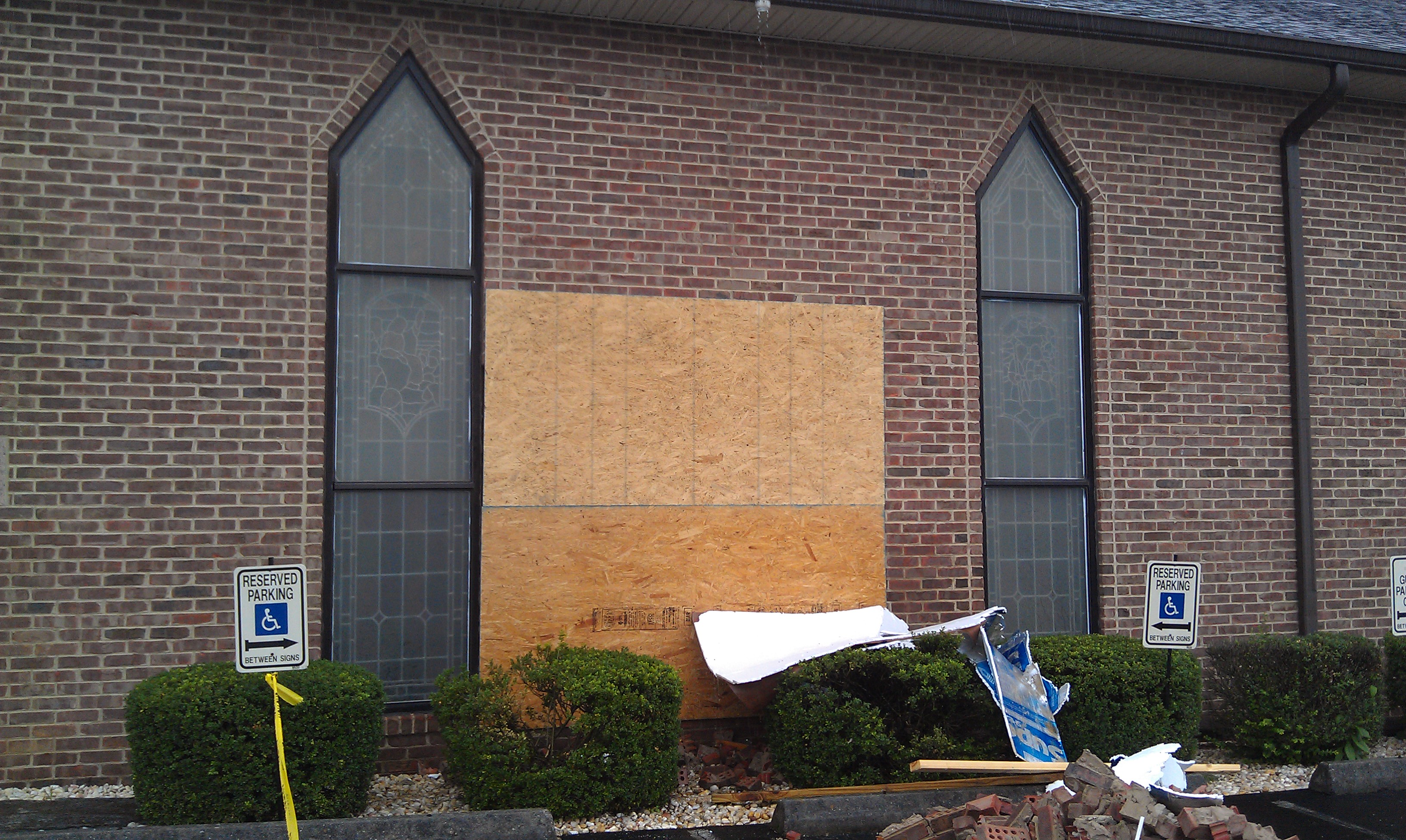 Great photos–and you don’t look sweaty!! That church damage is going to be tricky to fix on that brick.
