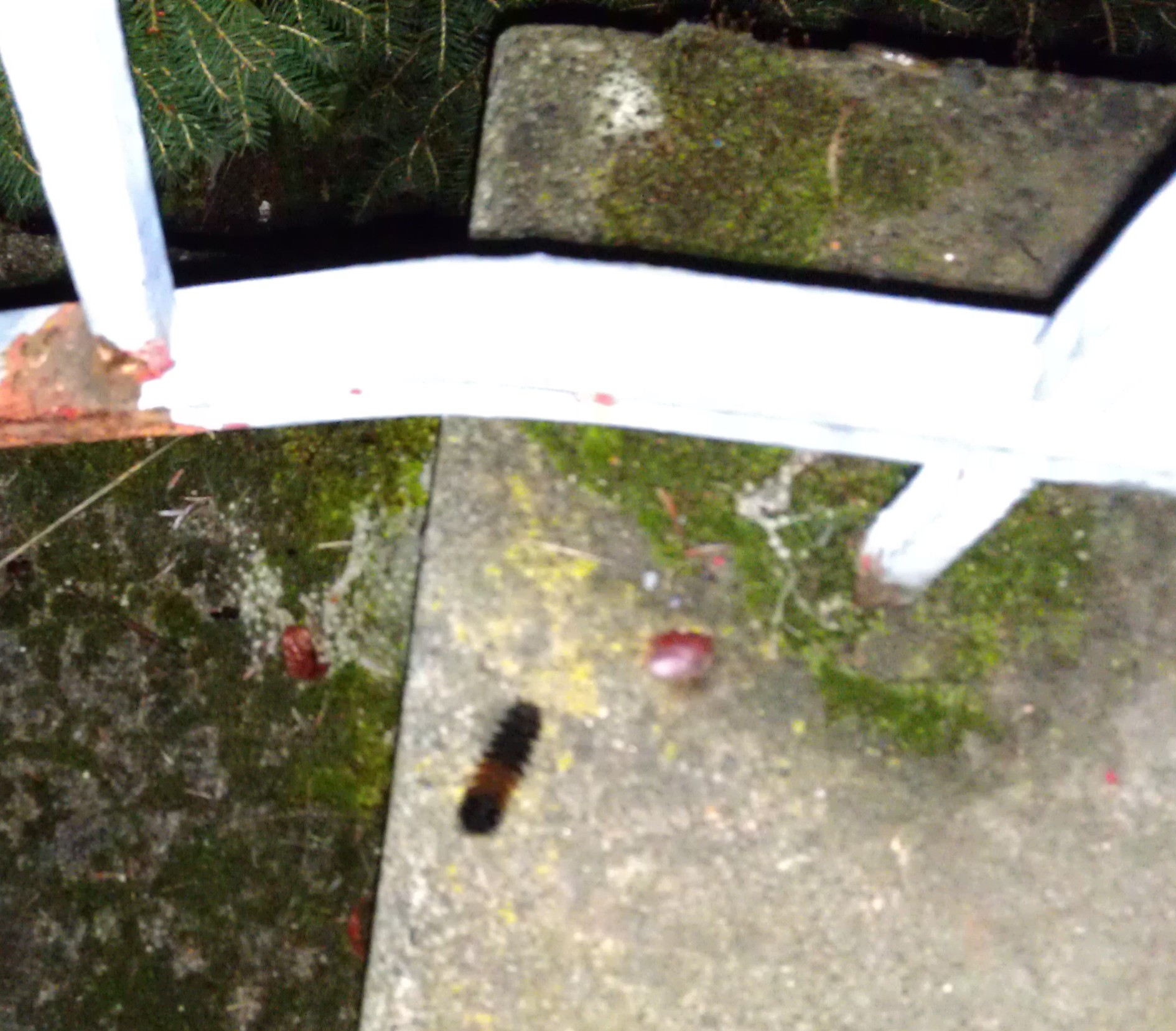 Not a small little green wee bit of protein, but a woolly black and orange version – about one inch long.