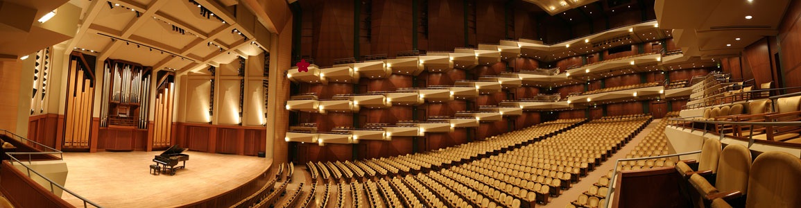 The hall’s traditional shape, defined by massive wood and plaster surfaces, is faceted and coffered to provide excellent acoustics and diffuse sound effectively. Orchestral performances require long reverberation times, which require surfaces that are heavy and dense to reflect sound and absorb as little as possible. The wood paneling on the walls is subdivided into smaller panels, each one a different size so that each one resonates with a different frequency of sound. The arrangement of how those panels are put together, the subdivisions of those panels and the fasteners of those subdivisions are all expressed in the way the wood paneling is detailed. The result is that the physics of the acoustical design becomes an important part of the architectural design. In addition, distractions in the form of airborne sounds or earthly rumbles from surrounding streets, the transit tunnel, or the railroad tunnel below the site have been eliminated by building the hall as a box within a box, with the inner concrete box completely supported on rubber pads.