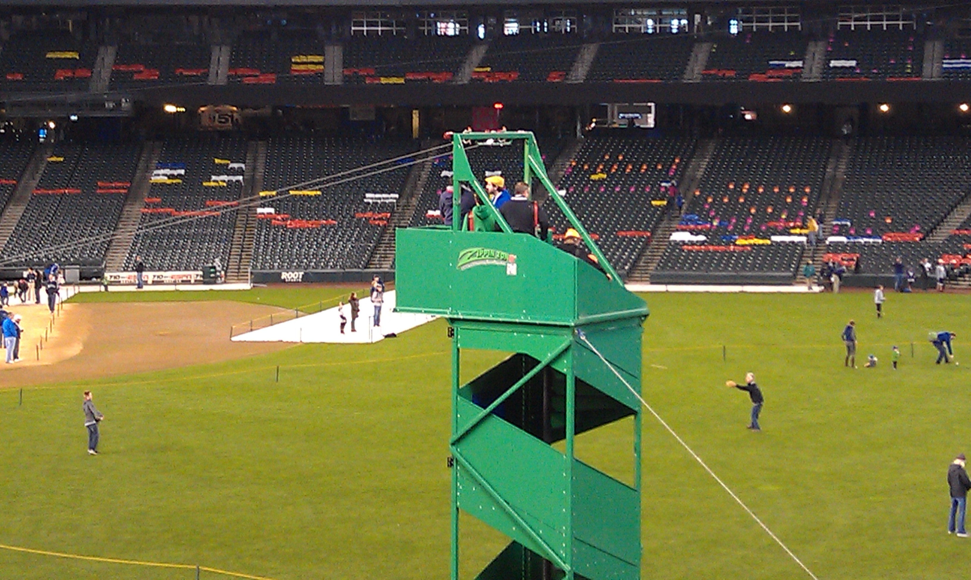 You can not see it in this fuzzy picture, but the white screen shows a video of Felix pitching, and when he releases the ball it flies out of the hole in the screen.