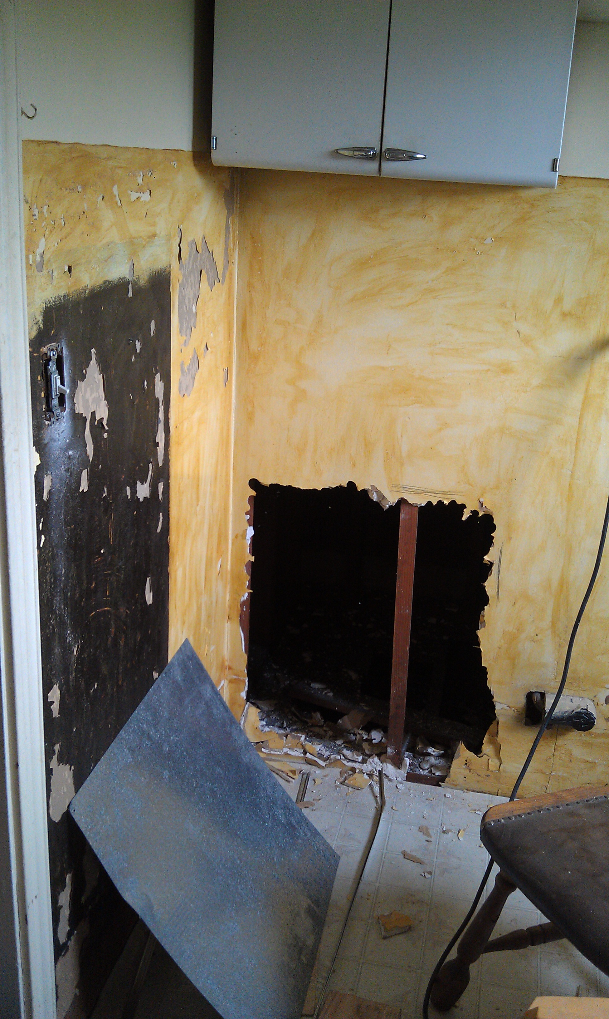A new hole appeared in the upstairs kitchen to provide access for new insulation. (Or any insulation)