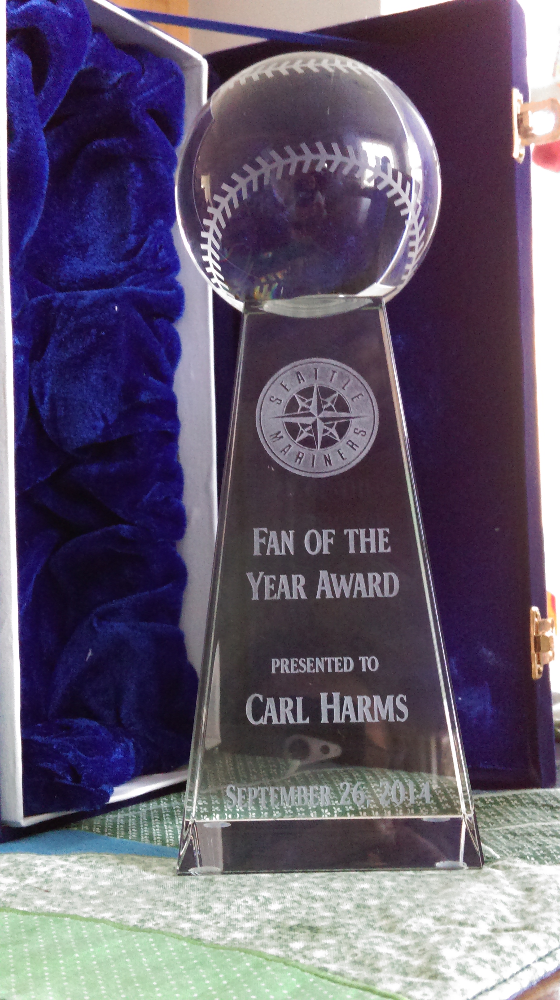 Carl searched through his upstairs area and I made a brief foray downstairs, but we did not find anything out of place. Then in the morning, with the benefit of light, Carl’s Fan murder weapon trophy was found on the floor. This is a rather heavy piece of leaded glass.