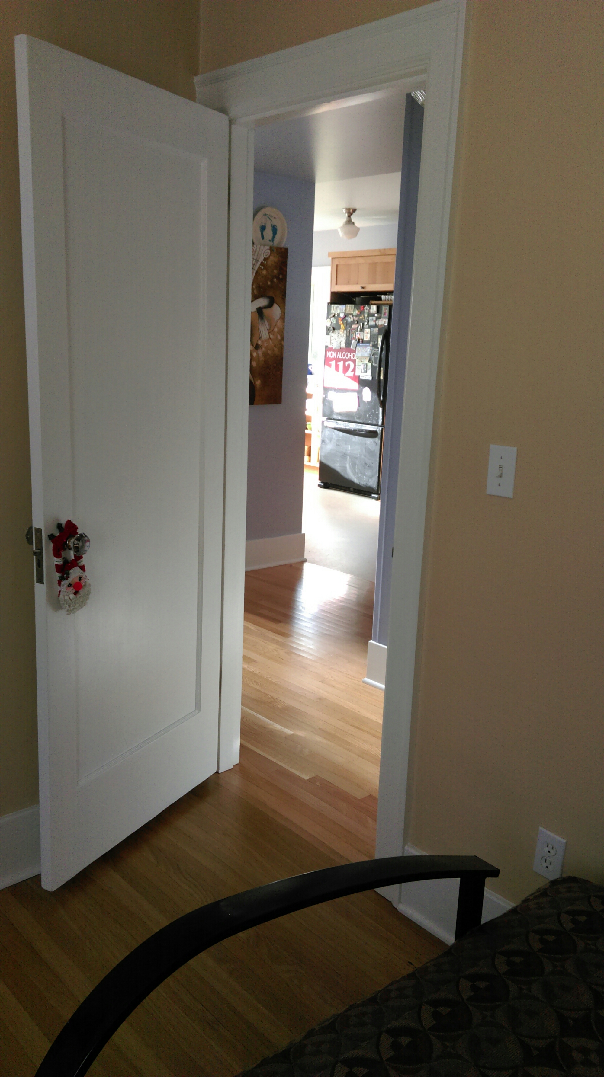 Next up was moving the futon from the living room to the indoor heated guest room/study. The futon has a moving part for changing from couch to bed. And big rounded arms. And it had to negotiate three turns in quick succession. There were several pauses to reconfigure the futon frame, and a brief suggestion to take it apart and rebuild it in the room. That’s when Carl took a moment to size up the situation and found the key position to make it through three doorways at once.