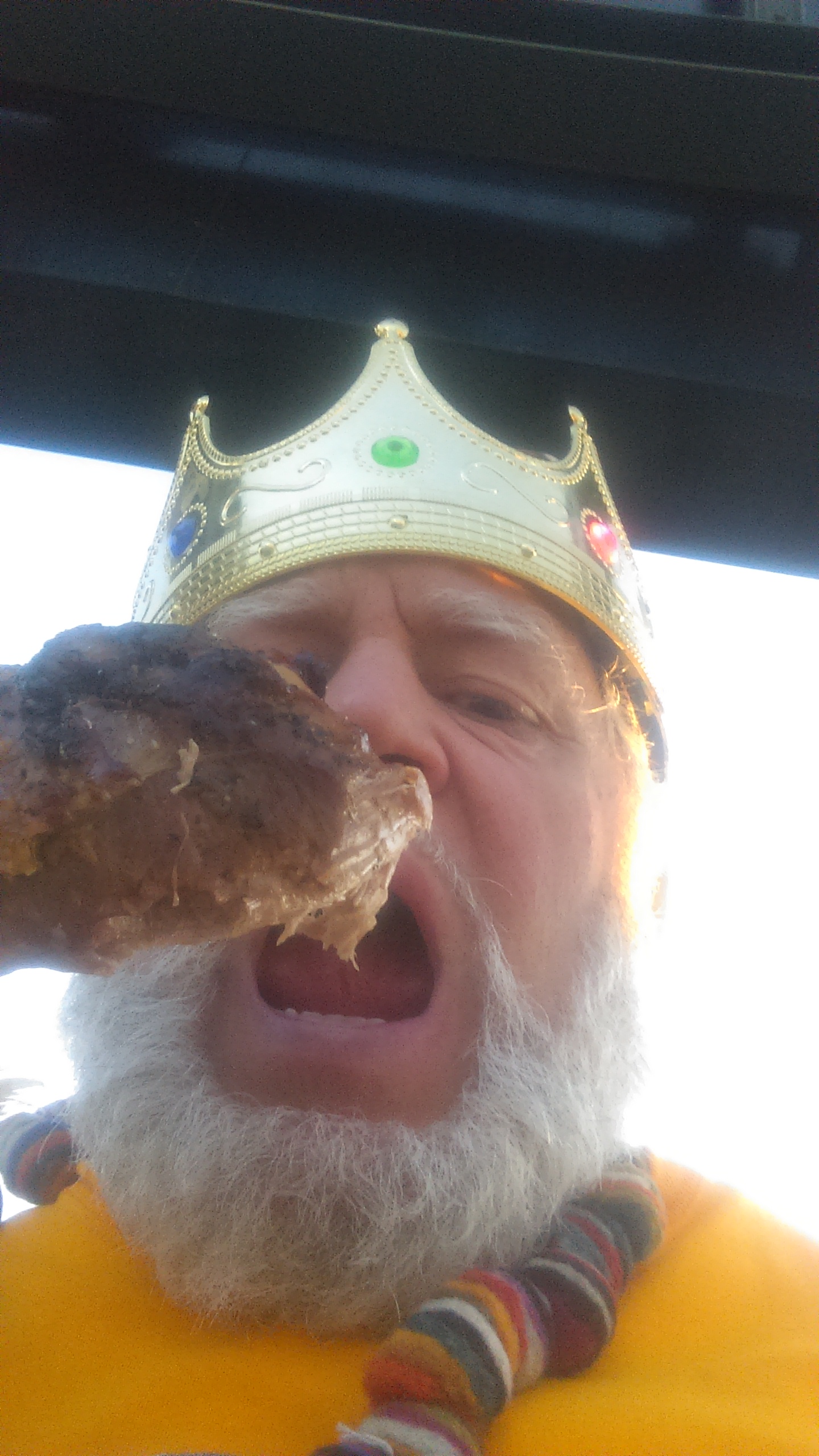 The full glorious sunny weekend that was spent walking and watching, when we were actually too hot on a Sunday in early May. (I am still taking lots of clothes to the game tonight.) Felix Hernandez pitched one of the games and we sat in the K section. To celebrate Felix the King, they give out a roasted turkey leg to a deserving fan, and they gave it to Carl.
