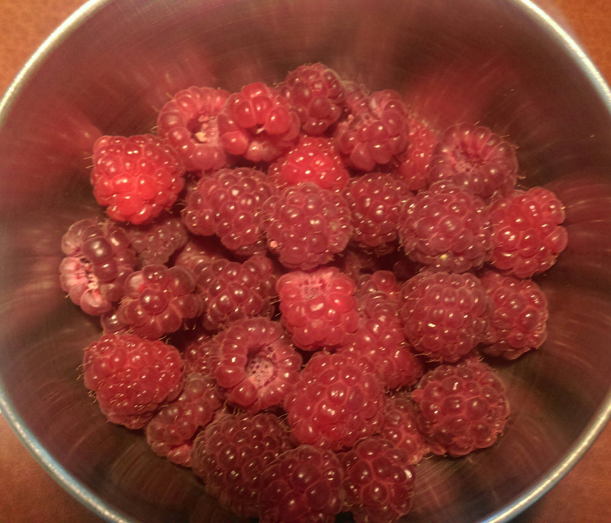 Today is even hotter than yesterday, probably in the 90s. Carl did some yard work, and I did my small part around the raspberries. Including the first harvest of the year.