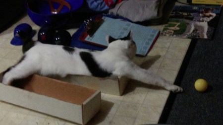 On to the championship series. We rode out the not quite as strong as predicted storm in the basement of a friend. Luckily it is home to his large screen tv and couch. Carl brought his usual assortment of parephanalia of the day. But the best toy was the empty box.