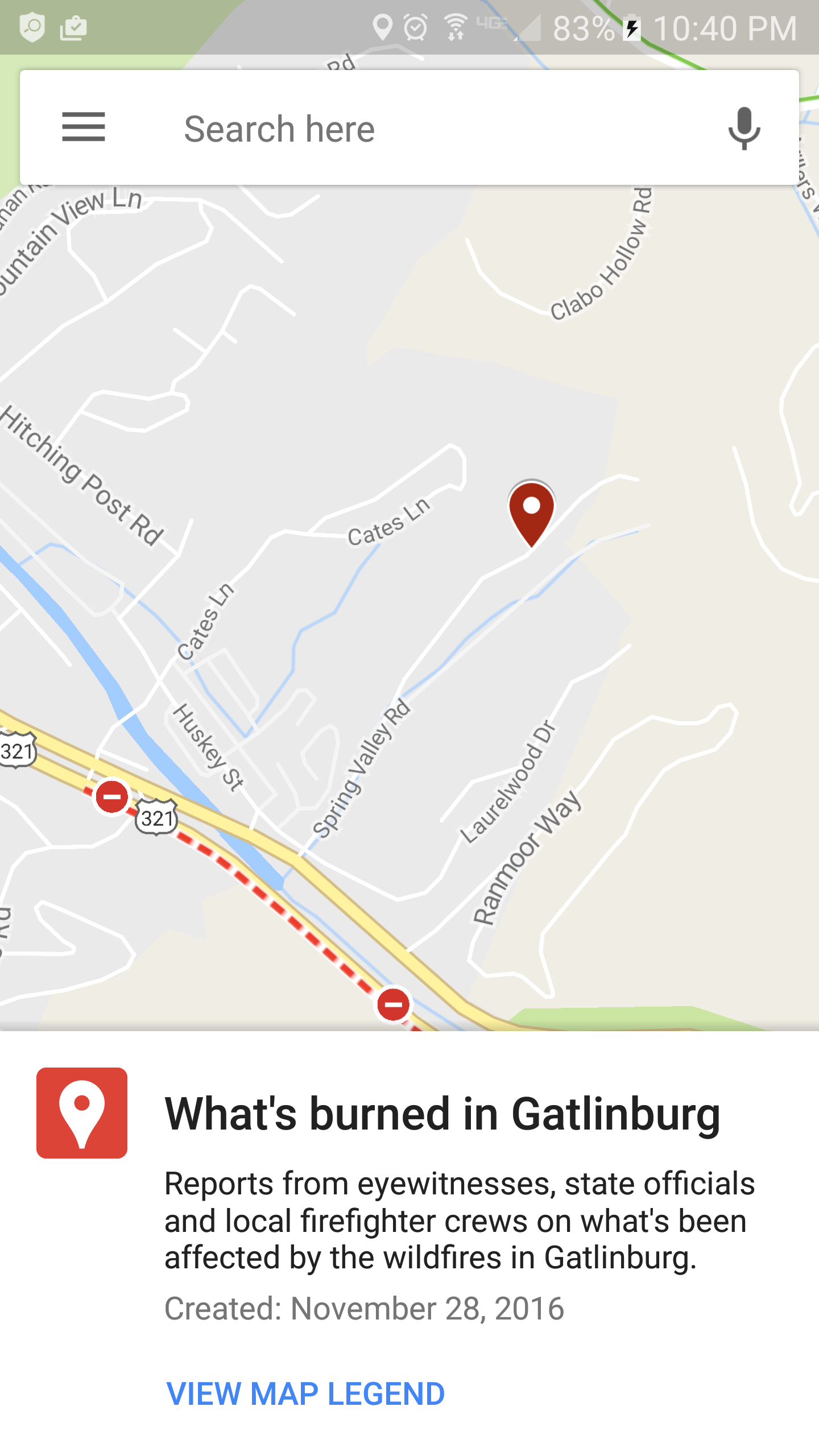 I was relieved and happy for him. Then I was browsing news reports and found a link to a map showing where some of the buildings that burned were located. One is located just down the road from his apartment. On the map below the marker is a building that burned. Rey’s apartment is about above the word Spring in Spring Valley Road.