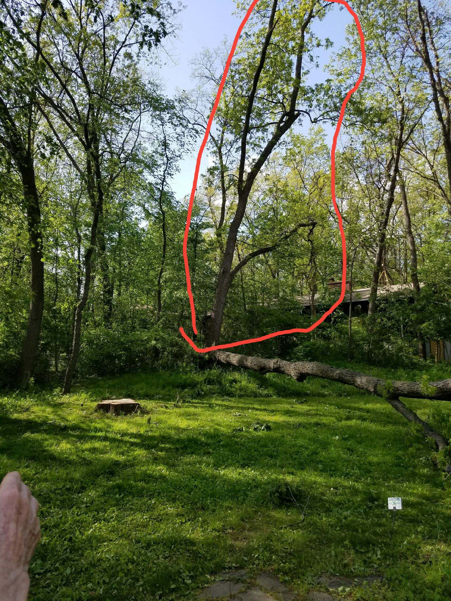 Just before my Michigan visit in March a big storm had blown through town, complete with trees down and power outages. Jane pointed out a tree at the parents house that was still upright but the split trunk appeared to be more split than before the storm. Much discussion ensued, with Jane and I leaning toward removing the leaning tree. Dad was of the opinion that the tree would continue to remain standing, and if it didn’t, was more likely to aim at the neighbors house.