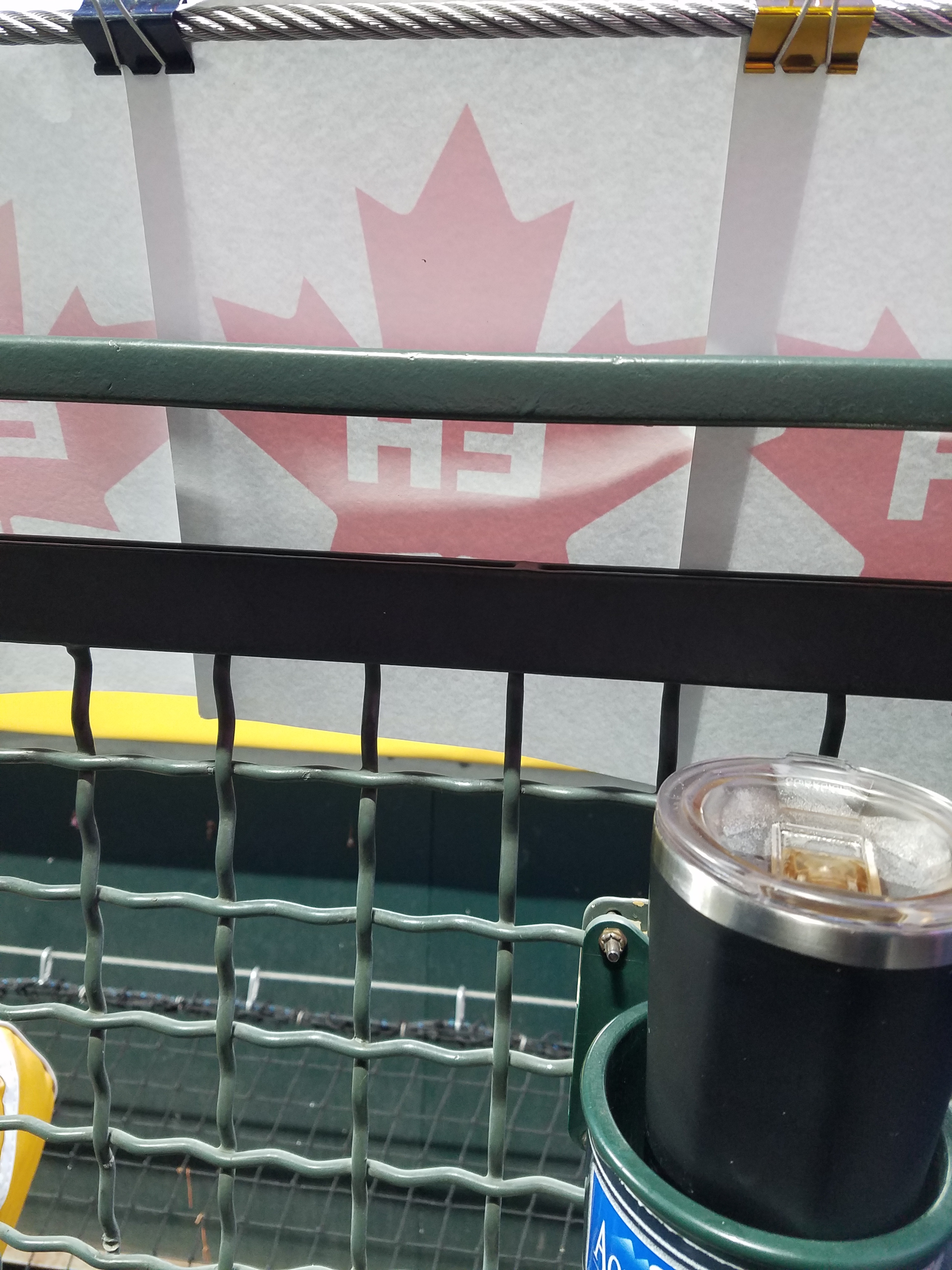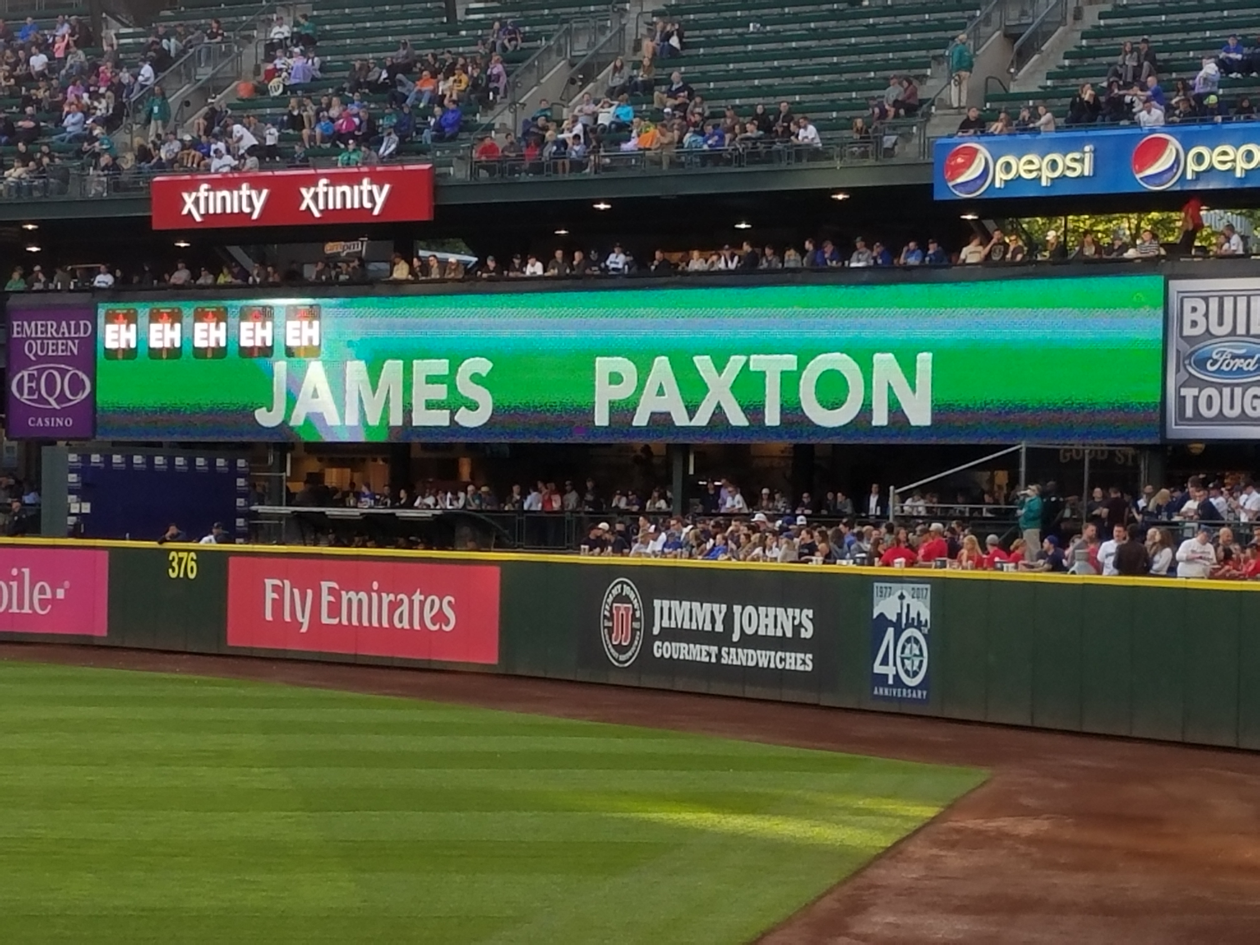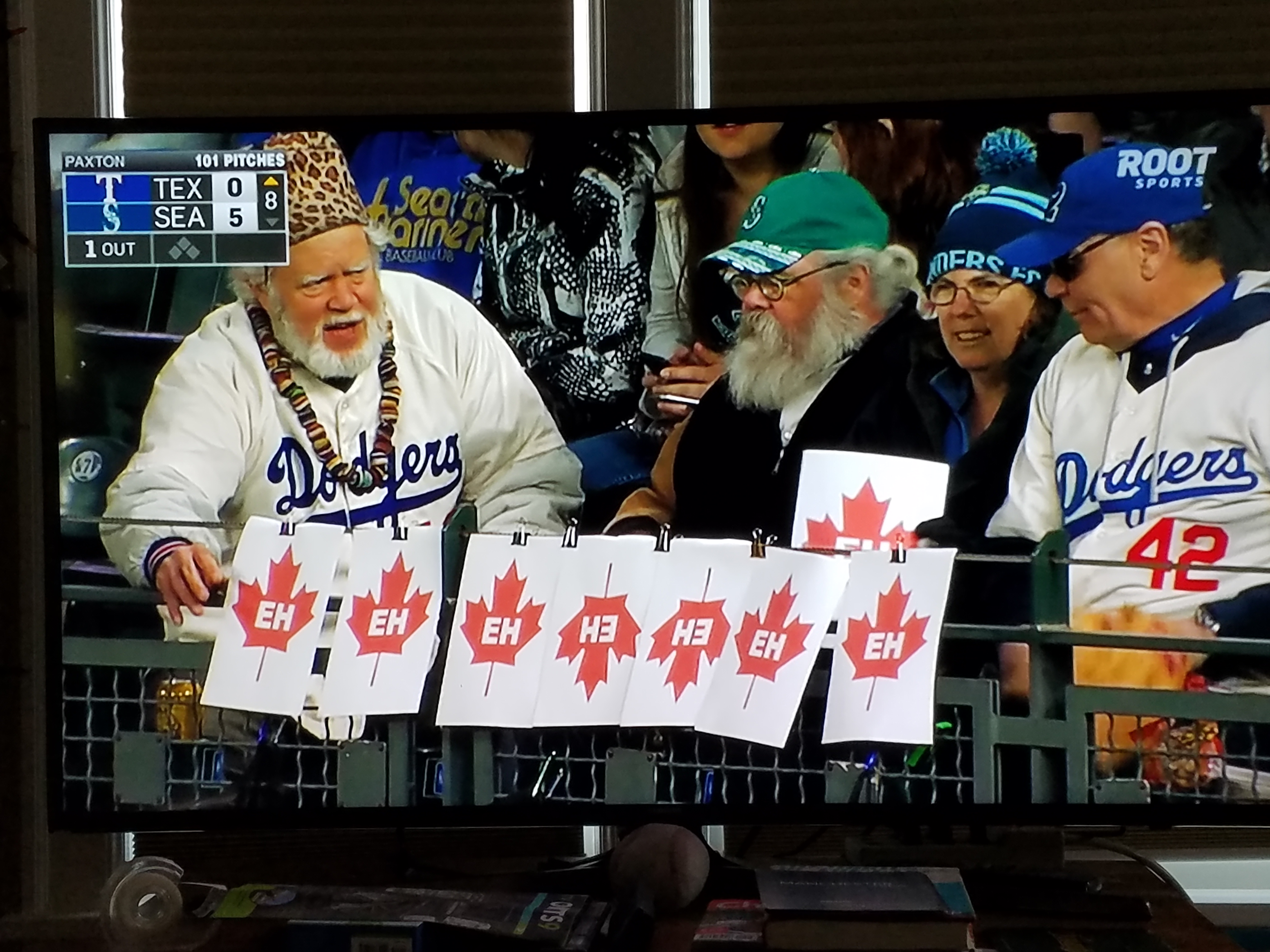 This was April 16th, early in the Mariner season. Paxton, the Mariner pitcher, is Canadian. Instead of “Ks” for his strikeouts, we chanted “Eh, Eh, Eh, Eh.” And hung an Eh sign in a maple leaf on the railing for each strikeout.