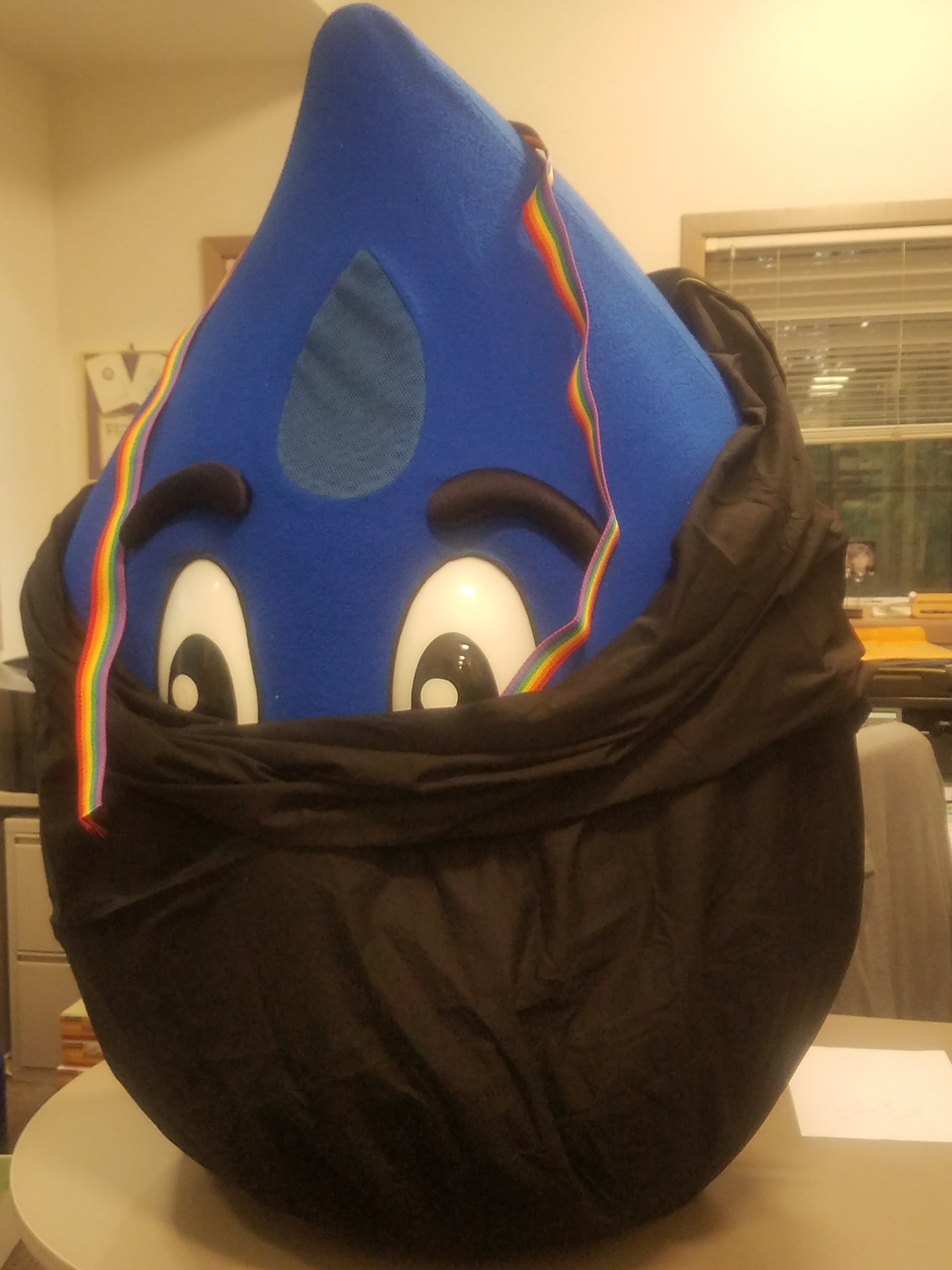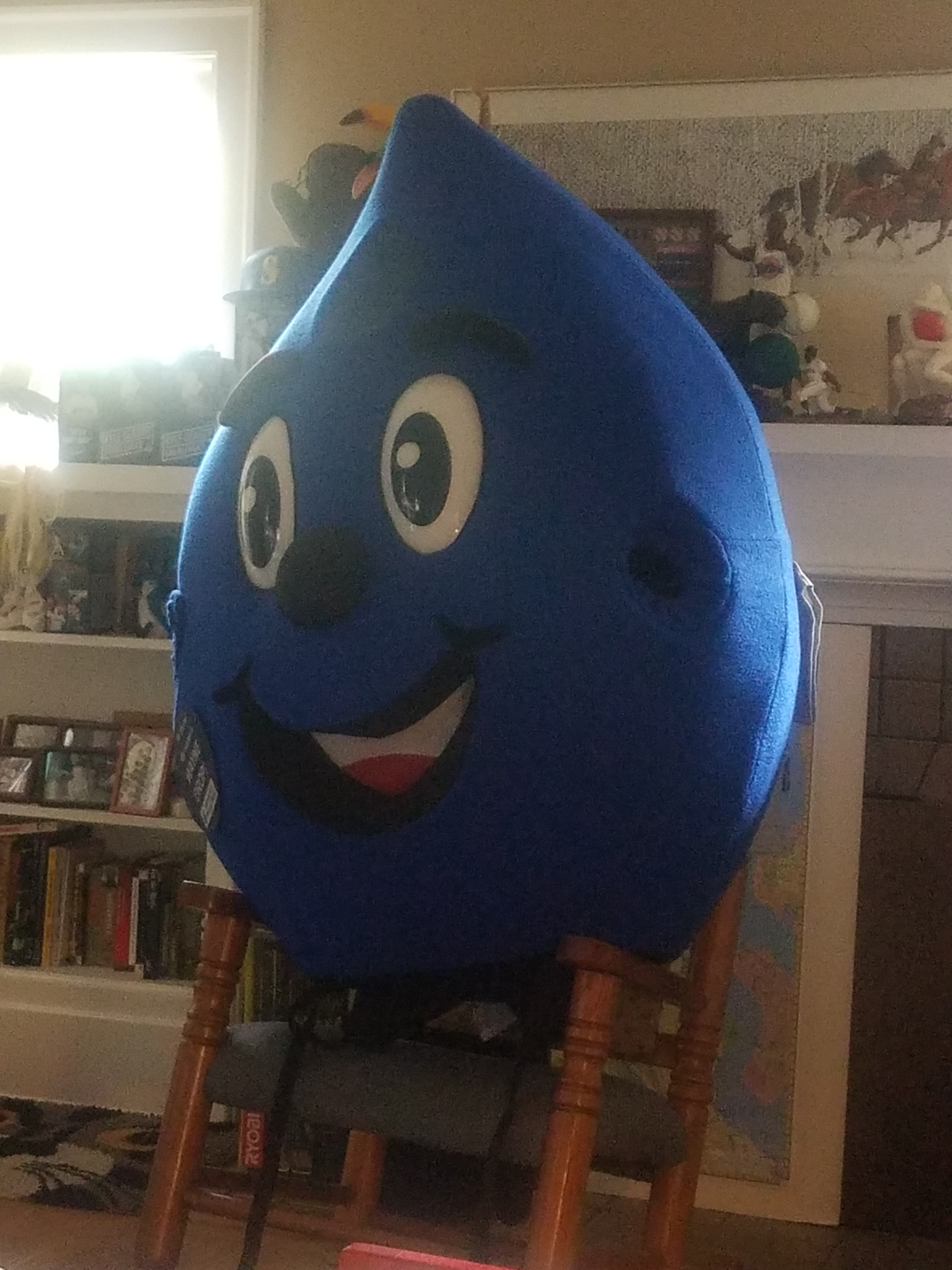 Wayne Drop had accompanied me home. He’s big and blue and friendly, but lacks appropriate outer wear for traveling to and from his engagements.