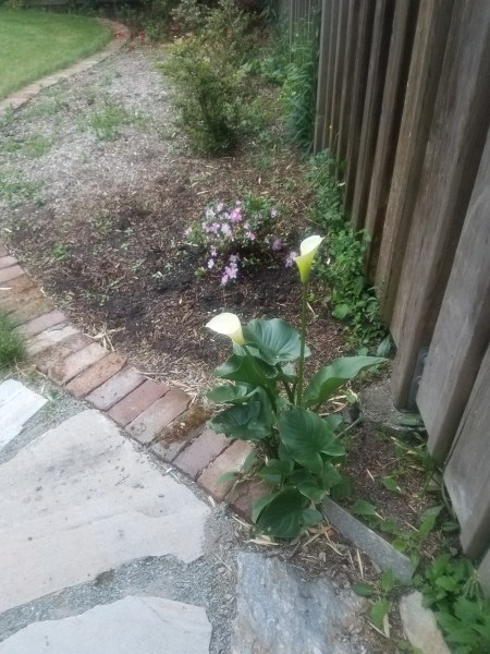 The new azalea/rhodedendron is demanding water everyday. I am obliging for now. (Note the cala lily that won’t be killed, regardless of any thing we do.)
