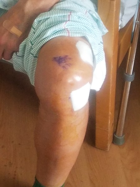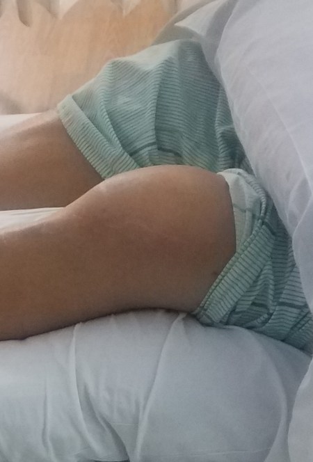 Knee was exposed, under shrink wrap. Looking good, still bigger than normal, but better than before.