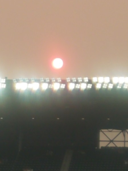 Approaching first pitch. It’s even less than clear looking across to home plate. It is raining ash.
