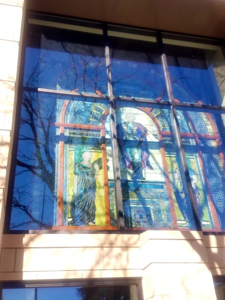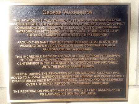 Steve suggested we wander by what had been a bar during our time in town, Washingtons. It has been repurposed as an auditorium, but one of the main decorations is still displayed. A stained glass window from 1895 depicting George Washington with the God and Goddess of Victory.