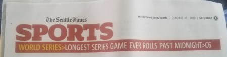 Jim departed after 13 or 14 innings, so he could work on food for Game 4. Doug texted at some point to find out how the Dodgers scored their second run in the 13th, because he had fallen asleep after returning home from watching the earlier innings in a bar. I went to bed in the 15th. (I was essentially sleeping in a chair, and it was well past 11 PM.) Carl and Kevin lasted all 18 innings. The losing pitcher threw 97 pitches, and won’t be starting today’s game.