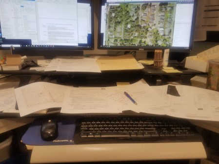 I was alternately focused and scattered. This was my desk at the end of the work day. I had hoped it would all be back in its file, but no. It is now tomorrow’s morning chore.
