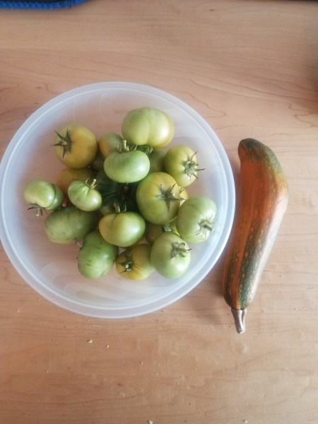 Finally home after ~4 miles, I used the last of my morning energy to pull all of the hoses under the house, and pick the last of the tomatoes. They are not ripe, we’ll have to see how the second crop turns out. Oh, and a zucchini that was hiding. I’m not sure whether it is edible.