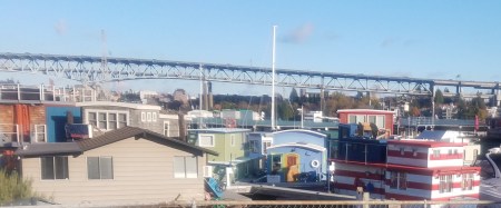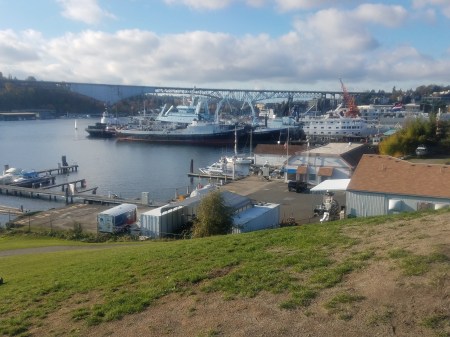 Looking east, to the I-5 Ship Canal Bridge. See the vehicles on top.