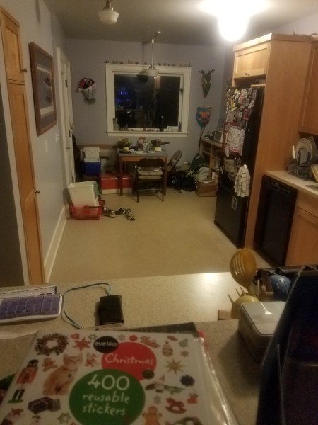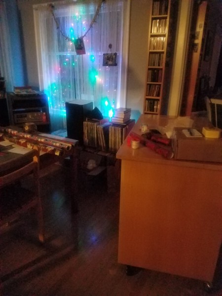 I figured it was time to start wrapping. Things to consider: 1) my back still hurts, but not as much, 2) there are several pieces to wrap, 3) the best flat surface at a good height for this work is in the kitchen, 4) I like to be entertained while I work, 5) the entertaining device is not very visible from the kitchen. Carl, the solver, notes the best flat surface is on wheels.