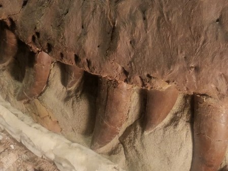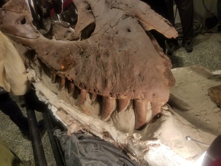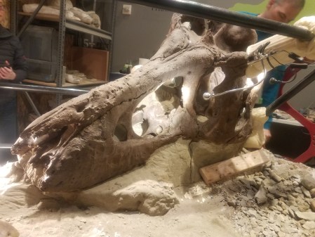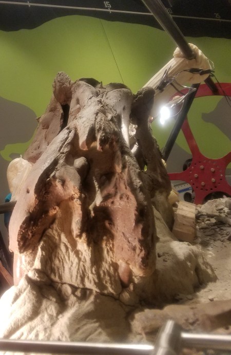 This is probably the most complete and best preserved of the 15 known t-rex skulls in the world. It is still being freed from the matrix it was found in, in Montana.