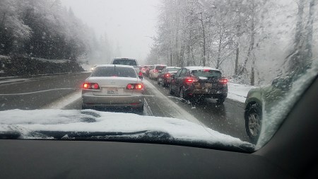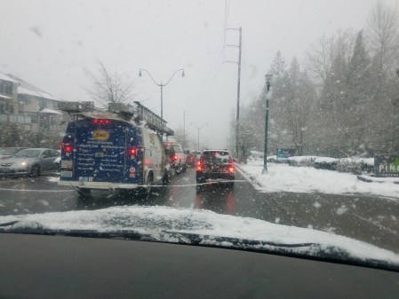 About 3 PM we were still on E Lake Sammamish Pkwy in Issaquah. That was about the time Jim threw a snowball at me, in the car. Finally, about 3:40, we reached the entrance to I-90. 2 hours and 20 minutes to go about 6 miles.