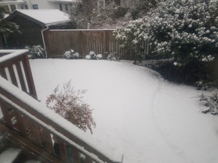 Backyard with remains of the early week snow that we missed.