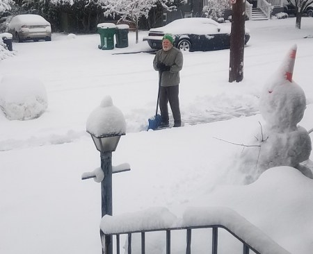 Shoveling as exercise. Not too dense. There are a handful of shovels on the block. Ours has been borrowed several times, and others are shoveling multiple lots. It is pretty clear from one end to the other of the block.