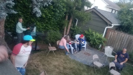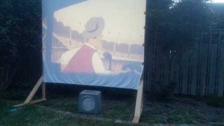 Saturday was the annual Backyard Baseball Film Festival. This meant folks for the weekend, four at our house this year. Food preparation, although nothing intricate. In the end, the most intricate part of the food was fitting it all onto the patio table. Sheeting the screen using the ever helpful binder clips. Chair setup and ice for the cold drinks.