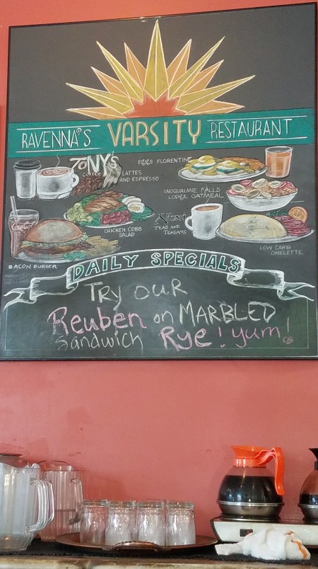 Taking a walk today. First one in a few weeks. Carl wanted to throw against a wall to loosen his shoulder, so we went to Ravenna Eckstein Community Center. I walked their path while Carl threw, and now we’re out for brunch at the Ravenna Varsity Restaurant.