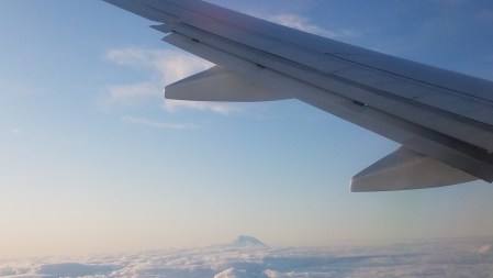 The good parts include a fairly uncrowded highway and airport, beating the main weather impacts out of town, and a relatively uncrowded plane. The 2 of us are sharing 3 seats, and the next row back is empty.