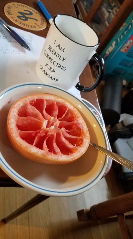 We don’t buy them because Carl can’t eat them due to medication interactions. But a consultant from work normally has a box delivered and I take one of those home. I do enjoy the grapefruit, but feel like I should have a splashguard! Always have to clean my glasses afterwards. Maybe when I’m rich I will hire someone to prepare my fruit. Peel me a grapefruit, Charles.