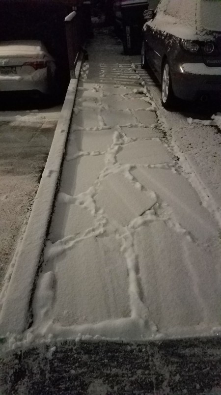 Still snowing. Actually not at this moment, but overnight again. Accumulations are small at home, with promises of more to come. The change today is colder temperatures. I shoveled and swept the front walk this morning, until my fingers got numb. I only had thin driving gloves.