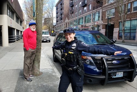 Practicing social distancing on the Ave. The officer couldn’t get close enough to cuff Carl, since he was diligently following the 6 foot rule.