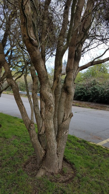 Today’s walk was quite a bit shorter, walking around the freeway. That is, we headed south, crossed over I-5, headed north, and crossed under I-5, then south home again. About 2 miles, not a bad walk. And it provided our tree of the day.