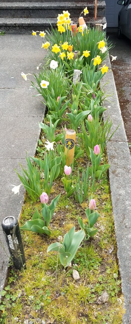 Sometime last fall I decided to refresh our front walk garden. I am happy that we did, just because there is more to look at, since we keep walking out and back by the same patch. The tulips in front are almost certainly new, along with some of the daffodils.