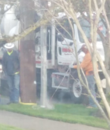 Starting the vactor truck work to dig the hole for the new pole. They use high pressure water to disturb the dirt, and vacuum it out of the hole.