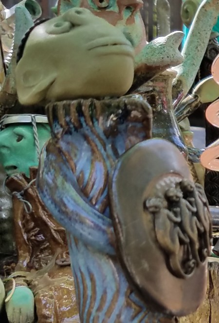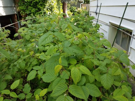 So next up was raspberry patch maintenance. The structure that pretends to contain the patch was the obstentious focus of the chore. The structure did need to have one bamboo piece replaced, but most of that work was on readjusting the old bits. Then the real work of weeding between the canes began. Especially trying to eradicate buttercup. Major inroads were made, but the chore was not completed.