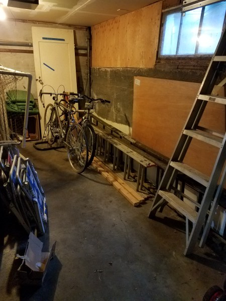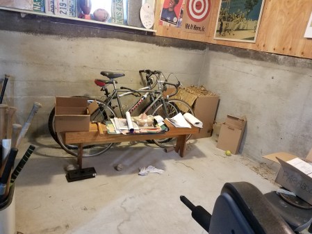 In this case, the weight machine needs a place to live. The location of choice was occupied by a bench, which could be shifted closer to a wall, except for 2 bicycles that have not been ridden in a decade. The 2 bicycles could move to the garage, they should really find a new home, so to make room in the garage. The garage has space, but it is cluttered and not fully organized.