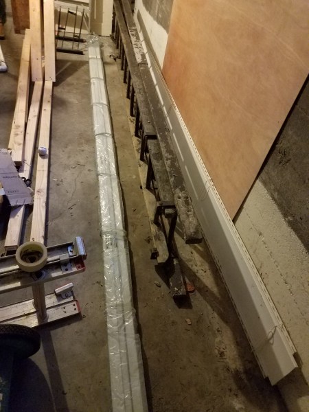 This is where I actually had some fun, figuring out how to wrangle, and make them more manageable for the long haul, and found a reuse for trash. The siding had been in a cardboard box, about 12 feet long, and disintegrating. The first step was to get rid of the cardboard. Step two was to get the 3 vinyl siding pieces to hold together. I actually just tied string around them at 4 places. Now they move, almost as one. Then there were the 5, equally long, mounting strips. And a moment of inspiration from a newspaper bag floating around the garage, which I tried to fit around the end of the mounts. It fit, and we have several newspaper bags that had not been recycled yet. The mounting strips are now encased in a series of 8 newspaper bags, taped at the joints. And they move almost as one.