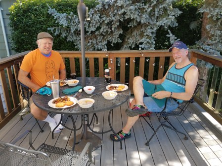 Except that we just finished having yesterday’s lunch leftovers for dinner. Matzo ball chicken soup. Yesterday’s lunch also included latkes and corned beef and pastrami hash. The occasion was the periodic distance gatherings on the patio. The normal 3rd baseball buddy was not in attendance, he was being tested for the C-19, after having a cough for the last few weeks. I am fairly certain it was at least two weeks since we have been 6 feet from each other.